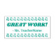 This inspiring rubber stamp design features the inspiring message "GREAT WORK!" and a customised teacher's, educator's or tutor's name. It also features a decorative musical note. It could be used by a school teacher, educator, instructor, or tutor when marking assignments, to acknowledge that the student has done well.