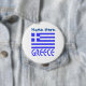 Personalised button pin featuring the Greek flag and the word, GREECE, below in blue. The flag shows blue and white stripes with a blue and white cross in the upper right area. Above it, add a name for a personalised touch to a stocking stuffer gift. Fun to wear at family reunions.