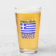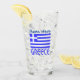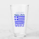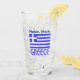 Personalised drinking glass has the Greek flag with the word GREECE below, in blue. The flag shows blue and white stripes with a blue and white cross in the upper right area. Above it, add a name, in blue letters, for a personalised or create a gift. Thoughtful housewarming gift for the home bar. Great for celebrating Oxi Day.
