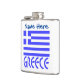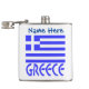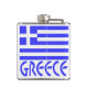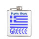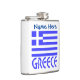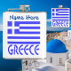 Personalised flask featuring the Greek flag and the word GREECE below in blue. The flag shows blue and white stripes with a blue and white cross in the upper right area. Above it, in blue letters, add a name for a special touch or create a gift. Fun to put your ouzo or Metaxa in for travel. Great for celebrating Oxi Day.