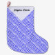 The Greek flag and the word, or name GREECE below in blue, tiled diagonally for an artistic look.. The flag shows blue and white stripes with a blue and white cross in the upper right area. A white, textured space of squiggly squares holds a spot for your name to personalise an item or create a gift. Cool Christmas stocking for every member of the family.