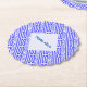 Design on party paper coaster features the Greek flag and the word, GREECE below in blue, tiled diagonally for an artistic look. The flag shows blue and white stripes with a blue and white cross in the upper right area. A white fractal of squiggly squares holds a spot for your name, in blue letters, to personalise these coasters for your party. And, for celebrating Oxi Day.