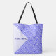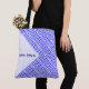 The Greek flag and the word, or name GREECE below in blue, tiled diagonally for an artistic look.. The flag shows blue and white stripes with a blue and white cross in the upper right area. A white, textured space of squiggly squares holds a spot for your name to personalise this tote bag or create a gift. Fun for travelers. Great for celebrating Oxi Day.