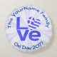 Round throw pillow featuring the blue and white Flag of Greece in a heart shape makes the O in the blue lettered word LOVE. Below it reads OXI DAY 20??. You can customise it to say anything you like. Perhaps, FAMILY REUNION 2030 or EASTER 2031? Above, a spot for your family name or any name you wish for added personalisation. The word LOVE sits in the centre of a digital art created white, fractal of radiating streaks. Fun gift for your favourite Greek!