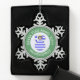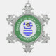 Pewter snowflake Christmas ornament has a black haired angel wearing the blue and white flag of Greece. She flies in a white circle of squiggly squares. White letters read GREEK FLAG ANGEL 20?? and, also, have a space for your name, or, someone else's. The background is green squiggly squares. Colours, green and white, were chosen, specifically, for Christmas Day.