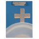 A cross on a white church against blue sky. The image was taken on the Island of Naxos, Greece,