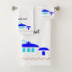Bath towel set, consisting of a face cloth, hand towel and bath towel with a Greek design. You can customise this bath towel set with the name of your favourite place in Greece or any other text of your choice. Should you require any help with customising then contact us through the message link on this page. Greek design bathroom towel set