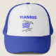 Waving Greek flag and words reading, "The blood of Hellas flows through my veins. And sometimes...its ouzo." Fun for a laugh on Oxi Day or anytime. Add a name and personalise this trucker hat. Use the CUSTOMIZE link and change the colour of the name or the font used for it, or both. Great fun for a family reunion.