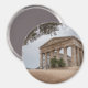 Round photo magnet with the ruins of the ancient Greek temple at Segesta, Sicily in Italy seen from under an old olive tree on a cloudy day.