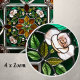 Green & Amber Rose Mandella Stained-Glass Look Ceramic Tile features a beautiful design of 4 roses and rosebuds with leaves and background in rich colours of amber, greens & creams, all done in a stained-glass look in the Mandella style. There are many applications for these wonderful ceramic tiles.