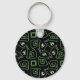 A tribal looking repeating pattern of stylised green lizard heads with eyes wide open on a black background.