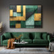 Geometric abstract art with blocks in emerald green, mustard gold, and gray. Texture resembling concrete and stone. Modern and sophisticated design. Ideal for interior decoration, offices, and wall art. A balanced composition that brings elegance and visual structure to any environment.