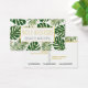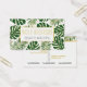 Green and gold tropical leaves business card. It features leaves of Split Leaf Philodendron (Monstera deliciosa) or Swiss Cheese Plant and palm leaves in green with gold outline . Your text is in a white frame with gold outline.