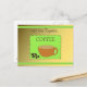 A modern design featuring a green sign that says 'coffee', a mug of steaming brew and a few loose coffee beans. A great card to invite someone to get together with you.