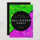 A modern invitation for a Halloween party. This design features an acid green slime pattern in a large diagonal stripe on one side with a magenta purple slime pattern in the other corner, divided by a black line. In the centre, there's a large black circle with space for your party details in a modern white font. On the back, there's plenty of room for more details about your event in matching fonts in white and lime green on a black background.