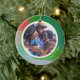 Personalise this ceramic ornament with two of your best photos and custom text and give an artful and modern Christmas ornament gift to loved ones or keep for yourself to remember a special moment in time or special person in your life. Each side has a unique photo framed within a border of a painterly and textured strokes in shades of green, red, and pale lilac and warm creamy white. The simple text is easy to customise with names, locations or dates and bring a smile to anyone that sees this sweet holiday ornament on the festive Christmas tree.