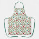 Lovely Christmas apron featuring green and red christmas patterns, pine branch and ornaments.