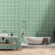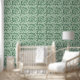 This peal-and-stick vinyl wallpaper features a foliage design named False Indigo by the creator. However, It's just a product of the artists' imagination and doesn't resemble a false indigo plant. The colours are green and cream. Use it in any room.