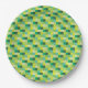 This party paper plate features squares in different shades of green and yellow in a pixelated pattern resembling 16 bit graphics in popular video games.