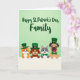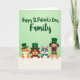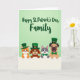 This card features a light-to-medium green gradient background with four friendly, humanlike animals leaning over a bright white divider, their faces close together like a cozy family photo 💚. On the left, an orange-striped cat with pointed ears wears a tall deep-green hat with a small golden buckle, gazing forward with a sweet, welcoming look. Next to it, a warm brown dog with floppy ears wears a matching green hat and smiles softly, as if sharing a quiet moment with the group. A dappled gray-and-white animal in the middle wears an emerald bow tie, tilting in toward the others in a way that suggests easy friendship. On the right, a tan pug-like dog wears a tall green hat and green bow tie, with its tongue peeking out for a light, cheerful touch ☘️. Across the upper area, the phrase “Happy St. Patrick’s Day, Family” appears in dark green lettering, centered above the characters. The hats and bow ties repeat in rich green tones, while the crisp white divider runs straight across the lower portion beneath their paws.