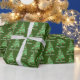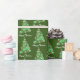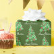 Merry Christmas modern abstract tree with green animal paw baubles on dark green paper. Holiday decoration red paper with red, green and white tree. Happy Christmas sentiment below tree can be changed to any text you want.