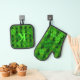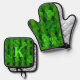 Irish green kitchen mitt and pot holder set. Four-leaf clovers pattern over green argyle print. Personalise with name on mitt and initial on pot holder, in bright lime green. This unisex design makes a great gift for anyone.