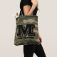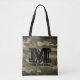Green army camo military camouflage all over print Tote Bag. Woodland pattern design with personalised monogram text. Medium and large size. Custom gifts for friends, family, soldier etc. Double sided print with black handles.