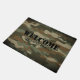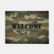 Green army camo military camouflage custom welcome Doormat with family name. Make your own personalised indoor or outdoor door mat with cool pattern. Add your own welcome message, business name, family surname, initial letters or funny quote. Unique Birthday gift idea for new home, office, cottage, hunting cabin, restaurant, store, sports shop, company, business, club, wedding party venue etc. Create your own masculine entry mat, rug for front door, entryway or hall. Customisable home decor and decorations for your house. Manly hunter pattern design with black text. Available in medium and large size.