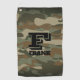 Green army camouflage military camo woodland pattern custom Golf Towel. Personalised present for him or her. Monogrammed golfing gifts for men and women. Manly Birthday gift ideas for golfer, soldier, husband, wife, mum, dad, father, friend, co worker, boss, colleague, sports coach, instructor, trainer, teacher, grandpa, retired person, golf lover etc. Including hook to hang it up. Unique golf accessories for friends and family.