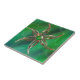 An abstract work in bright green and copper. A clear green gem is surrounded by copper-edged blades of grass accented with sparkling emeralds and orange starbursts. The waving, curving fractals in the background appear in deeper green, brown, and orange inside the copper filigree of the leaf motif.