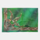 An abstract work in bright green and copper. A clear green gem is surrounded by copper-edged blades of grass accented with sparkling emeralds and orange starbursts. The waving, curving fractals in the background appear in deeper green, brown, and orange inside the copper filigree of the leaf motif.