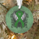Green ribbon with wings and filigree pattern. The green ribbon is associated Glaucoma Awareness in January. Bipolar Disorder Awareness Ribbon in February. Kidney Disease Awareness, Kidney Donation Awareness, and Mental Retardation Awareness in March. Environment Awareness, Living Organ Donation Awareness, Organ Donation Awareness, Organ Transplant Awareness, and Tissue Donation Awareness in April. Cerebral Palsy Awareness, Childhood Depression Awareness, Mental Health / Mental Illness Awareness, Missing Children Awareness, Neurofibromatosis Awareness, Spinal Cord Injury Research, Tourette's Syndrome Awareness in May. Tourette's Syndrome Awareness in June as well. Mitochondrial Disease Awareness in September. Depression Awareness, Manic Depression Awareness, and Literacy Awareness in October. Bone Marrow Donation Awareness in November. Eye Injury Prevention Awareness, Fanconi's Syndrome Awareness, Fibrodysplasia Ossificans Progressiva, Freedom Awareness, Growth and Rebuilding Awareness, Kidney Cancer, Nephrotic Syndrome Awareness, Neural Tube Defects Awareness, Primary Sclerosing Cholangitis, Safe Driving Awareness, Save Darafur Awareness, Stem Cell Donor Awareness, Stem Cell Research Awareness, Traumatic Brain Injury Awareness, Von Hippel Lindau Awareness, Worker Safety Awareness.