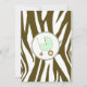 An invitation featuring a brown zebra print border across top and bottom with light green trim. Personalise the brown and green tango and blackletter font text with details of your event. Opposite side is solid zebra print with a green baby carriage inside a matching circle shaped frame.