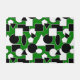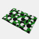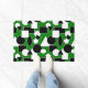This doormat has a Bauhaus design of triangles, circles, rectangles, and pentagons in black and white on a field of green.