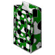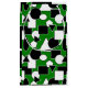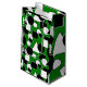 This gift bag has a Bauhaus design of triangles, circles, rectangles, and pentagons in black and white on a field of green.