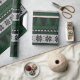 This wrapping paper has a green, black and white pattern of trees and snowflakes that looks like a knitted Christmas sweater.