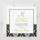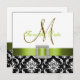 Sophisticated elegance is conveyed by this beautiful wedding Save the Date Card design on a square format. A black and white floral damask pattern serves as a background for a photo effect of the Metallic Gold Initial M and a green satin ribbon and diamond brooch ALL PRINTED on a FLAT CARD Save the Date Wedding Announcement. A perfect way to inform your guests of your upcoming wedding. Contemporary, yet classic damask pattern with a design which allows you to personalise the front with your names and the back is free to add your customised save the date text. The design is set for monogram initial "M". For other letters, different ribbon colour and background please contact designer at luxuryweddinginvitations@gmail.com. Layout Design by Elke Clarke©. Graphics licensed. Also, choose from a variety of fonts and beautiful papers to make your wedding invitations PERFECT!