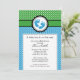 Adorable sweet foot prints Boy Baby Shower invitation featuring a baby footprint set on a blue & green polka dot background. Matching items available in our shop. Perfect for a baby boy baby shower.