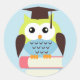 Cute children's graduation sticker featuring a green and blue owl sitting on a stack of books. Graphics ©Babystar Design.