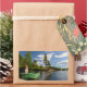 Rectangular photo sticker of a small green boat and a wooden cabin with some tall trees at the edge of the water in a fjord landscape in Byglandsfjord, Norway.