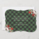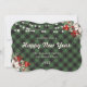 Elegant green buffalo plaid New Year card featuring a watercolor painting of poinsettia, holly and red berries along with string lights on a green and black buffalo plaid background. Easily personalize online.