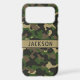 Customize this multi-hued green and brown camouflage iPhone 17 pro max case with your name in a trendy modern CAP font in brown on khaki. It's masculine and perfect for your favorite military, hunting, country or outdoorsman!