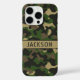 Customize this multi-hued green and brown camouflage iPhone 16 pro case with your your name in a trendy modern CAP font in brown on khaki. It's masculine and perfect for your favorite military, hunting, country or outdoorsman!