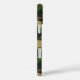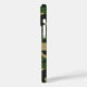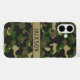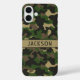 Customize this multi-hued green and brown camouflage iPhone 16 plus case with your name in a trendy modern CAP font in brown on khaki. It's masculine and perfect for your favorite military, hunting, country or outdoorsman!