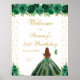 This elegant and glamourous birthday party welcome sign features a beautiful princess with brown red hair and fair skin in a green ball gown. The text combines handwritten script and modern sans serif fonts for a classy and sophisticated look. The floral arrangements, butterflies and gold confetti create the perfect blend of rustic and chic.