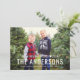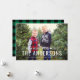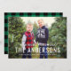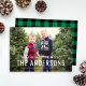 Send warm greetings with a full-photo design featuring bold family-name typography and a clean “Warm Holiday Wishes” message. Crisp white lettering keeps the look modern while letting your photo shine. The coordinating back features classic green buffalo plaid for a cozy cabin finish. Personalize the year and family names for a polished keepsake.