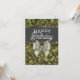 Custom birthday card with "Happy birthday" in mixed typography, silver bow, satin ribbon, and green camouflage background.