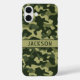 Customise this multi-hued green camouflage iPhone 16 plus case with your name in a trendy modern CAP font in dark green on light green. It's masculine and perfect for your favourite military, hunting, country or outdoorsman!