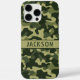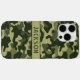 Customize this multi-hued green camouflage iPhone 16 pro max case with your name in a trendy modern CAP font in dark green on light green. It's masculine and perfect for your favorite military, hunting, country or outdoorsman!