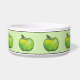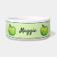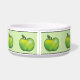 Destei's green cartoon apples on a light green background colour. There is also a personalizable text area for a name in black colour font. The top and bottom have a thin black border as well.